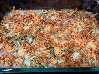 - Place the baking dish in the preheated oven and bake for 20 minutes or until the topping is golden brown and the casserole is bubbly.